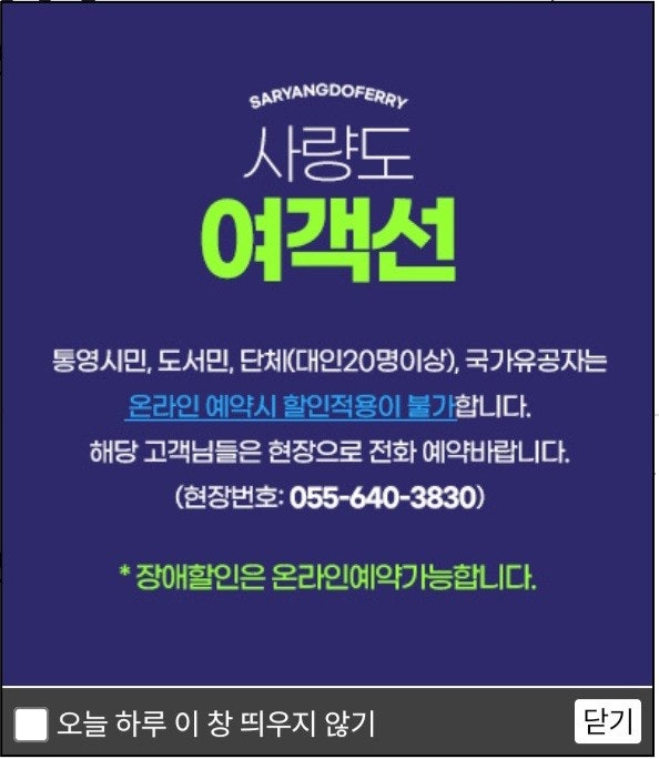 ※ 사량도 여객선 온라인 홈페이지는 수시로 오픈되지 않기도 합니다.